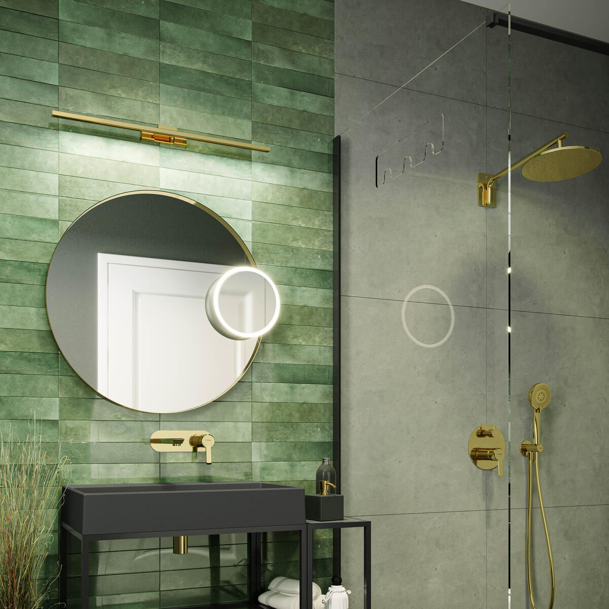 Kuldkroom seinapealne valamusegisti Deante Arnika messingust valmisatud ümbris ja keraamiline ACS seadeosa tagavad toote pika kasutusea.