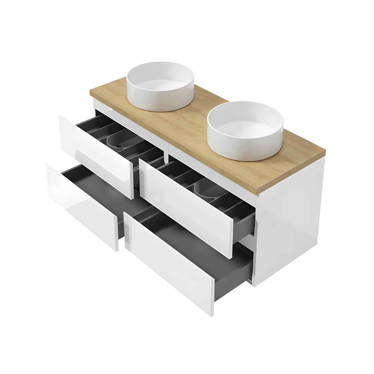 Kapi kaks vaikseltsulguvat sahtlit on varustatud DefraSlim mehhanismiga, mis võimaldab maksimaalset ruumikasutust ning tagab vaikse ja turvalise sulgumise. Freesitud 45° esiservad loovad minimalistliku käepidemevaba disaini, mis sobib ideaalselt tänapäevastesse vannitubadesse. Reguleeritav riputussüsteem võimaldab kapi lihtsalt ja täpselt seinale paigaldada.