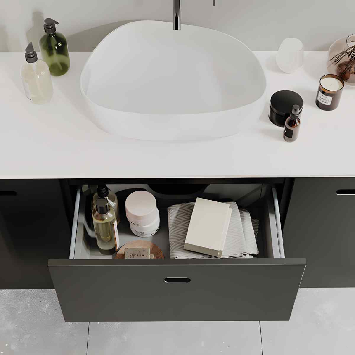 Toob vannituppa musta mati minimalistliku joone ja laia, mugava pesuala. Integreeritud freeskäepidemed mõlemal sahtlil hoiavad fassaadi puhtana ja pakuvad loomulikku haaret – eraldi nuppe pole tarvis. Täisväljatõmmega sahtlid annavad ligipääsu kogu sisule, DefraSoftClose tagab vaikse, pehme sulgumise ning grafiitne sisemus püsib korrapärane ka igapäevases kasutuses.