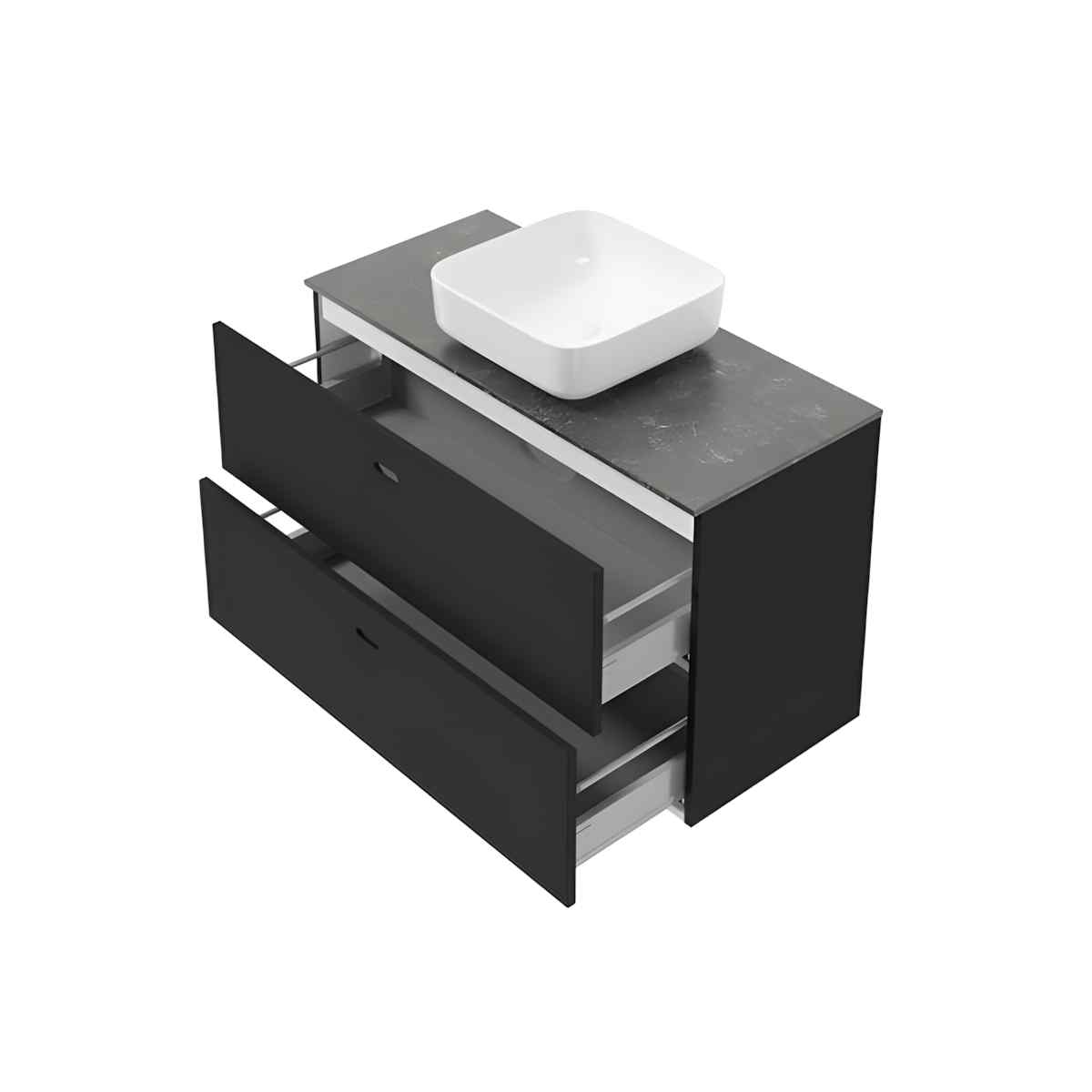 MO-RE D100 on 100 cm lai seinale kinnitatav sahtlitega valamukapp musta mati viimistlusega ja integreeritud freeskäepidemetega.