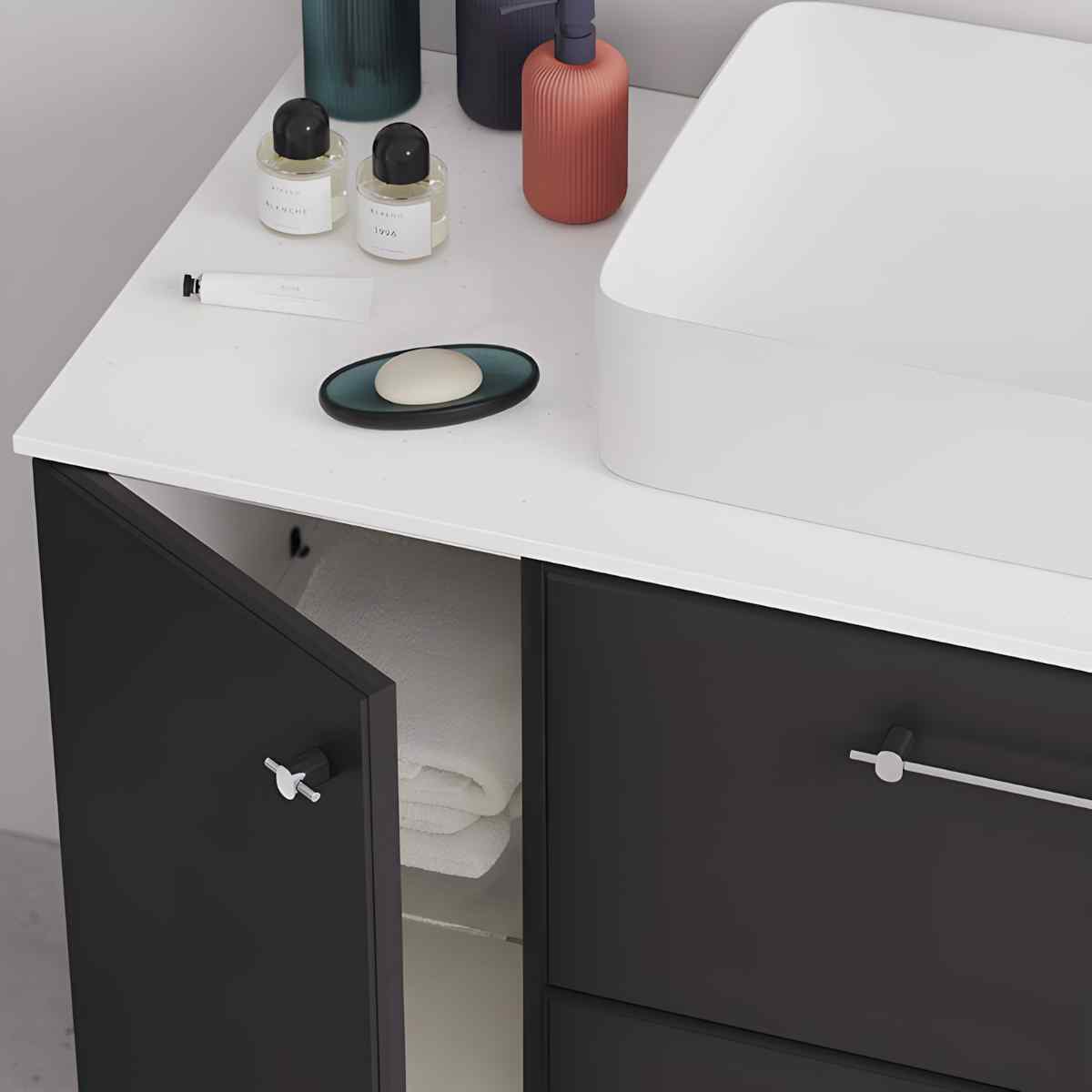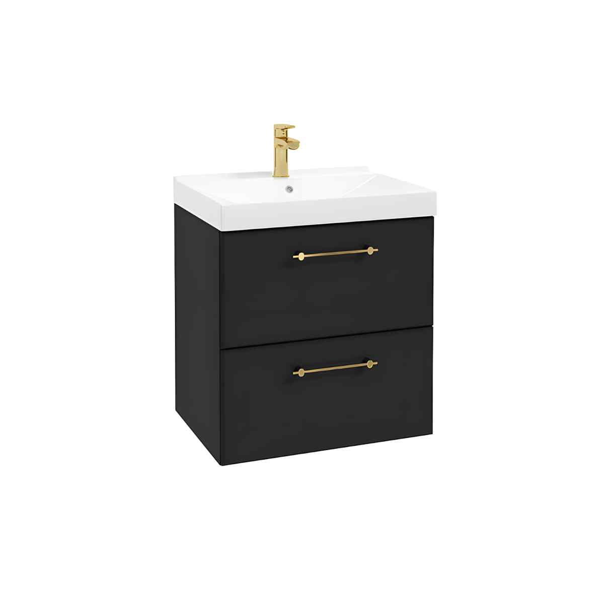 MO-RE D60 on lai seinale kinnitatav sahtlitega valamukapp modernsesse vannituppa. Mõõdud: 59,9 × 60 × 45,1 cm (L × K × S). 2 sahtlitSoft CloseDefraMax (rohkem kasutatavat põhja-pinda). Grafiiditoonis sisemus, reguleeritavad riputid. Esipaneelil geomeetriline freesdekoor, TWIG käepide on lisavarustus (kuld/kroom/must).