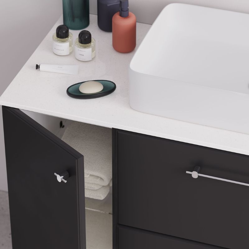 Töötasapind 120 HI-MACS® ühendab esteetilise elegantsi ja praktilise vastupidavuse. Materjaliks on akrüülkivi, mis on valmistatud looduslikest mineraalidest ja pigmentidest. Tänu sellele on pind mittepoorne, antibakteriaalne ja vastupidav niiskusele, mis teeb selle ideaalseks lahenduseks vannitoas.