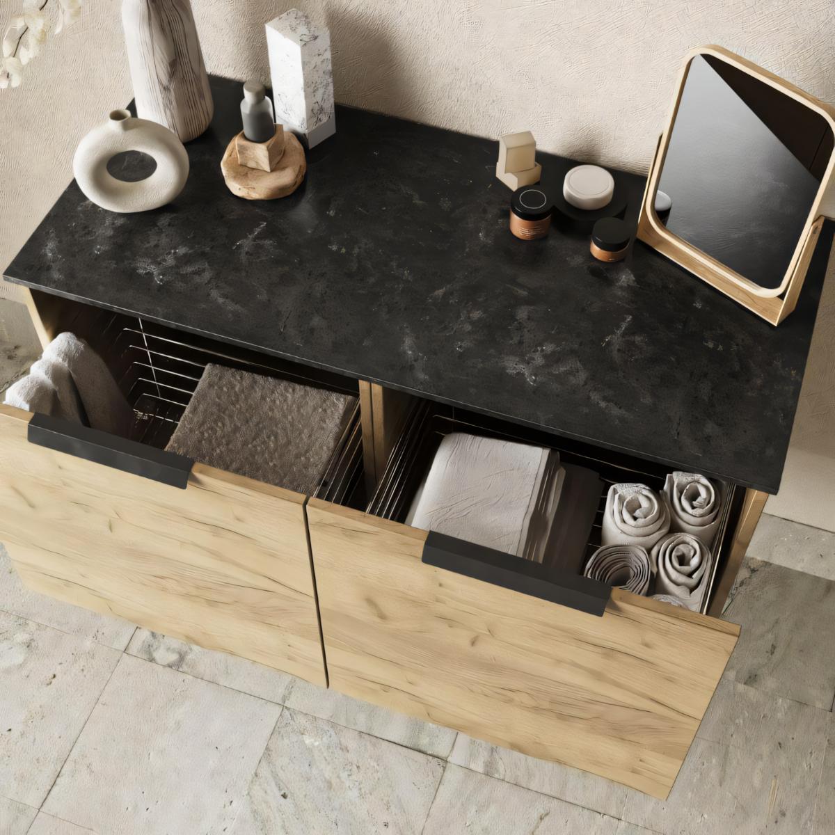 Töötasapind 120 HI-MACS® ühendab esteetilise elegantsi ja praktilise vastupidavuse. Materjaliks on akrüülkivi, mis on valmistatud looduslikest mineraalidest ja pigmentidest. Tänu sellele on pind mittepoorne, antibakteriaalne ja vastupidav niiskusele, mis teeb selle ideaalseks lahenduseks vannitoas.
