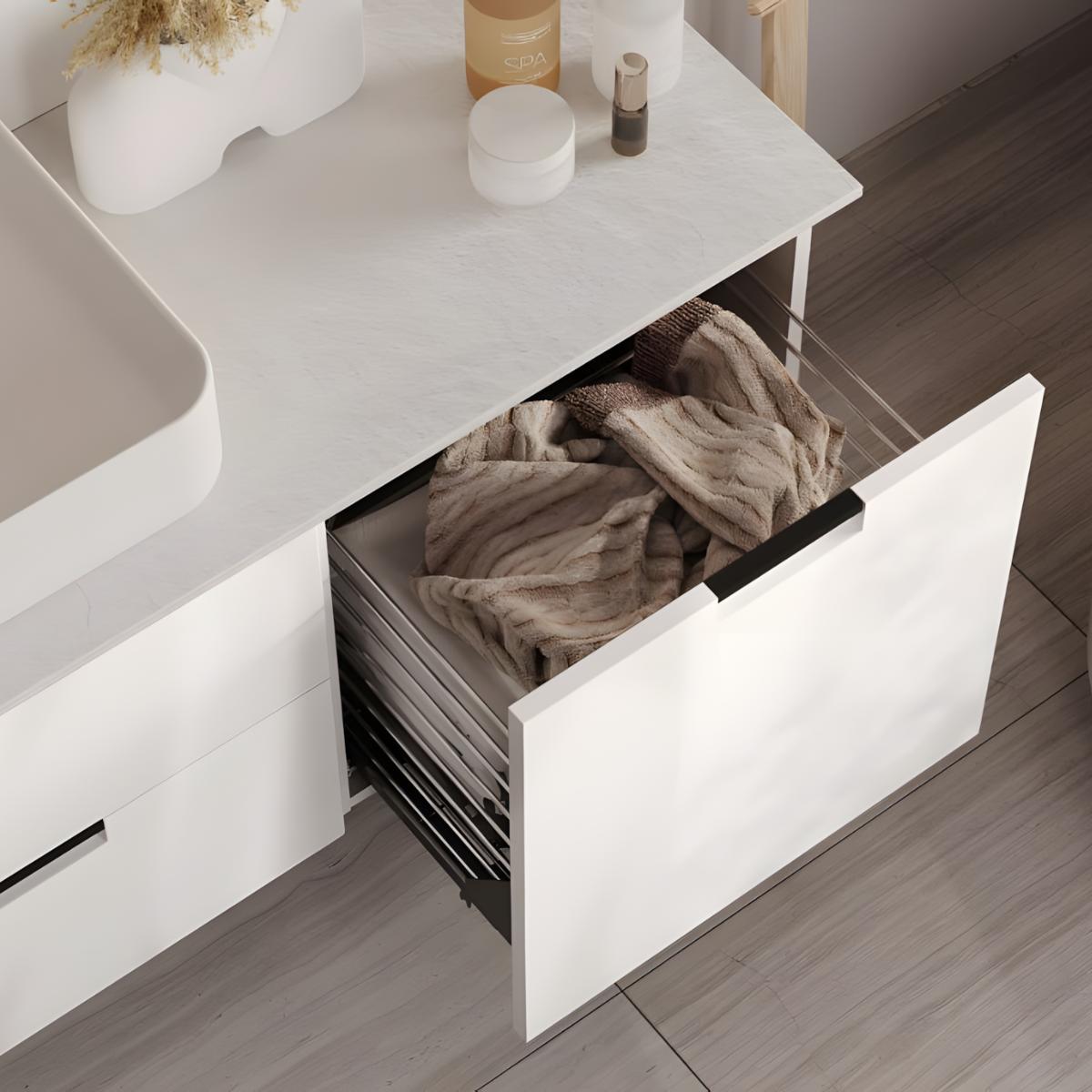 Funktsionaalses plaanis on see töötasapind ideaalne täiendus vannitoakappidele, pakkudes terviklikku ja viimistletud lahendust. Tänu oma universaalsetele mõõtudele saab seda kombineerida erineva laiuse ja sügavusega kappidega, et saavutada harmooniline ja terviklik ilme. Valge toon sobitub suurepäraselt sama värvi mööbliga või loob kontrasti puitu imiteerivate kappidega, lisades ruumile soojust.