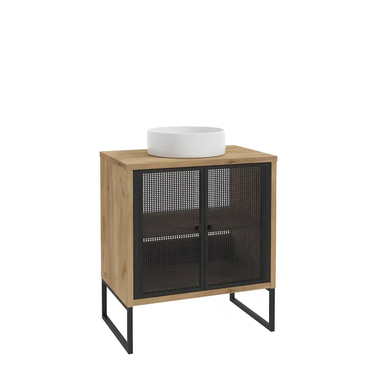 FIORA D70 ühendab industriaalse metalli ja sooja puidutekstuuri. Perforeeritud metall uksi on kerge hooldada, Soft Close, geomeetrilised jalad tõstavad korpuse maast – kergem koristada. Vaheriiul jagab sisu kaheks tsooniks, et rätikud ja tarvikud püsiksid korras. Soovi korral kasuta kappi tasapinna all ja lisa pealt paigaldatav valamu.